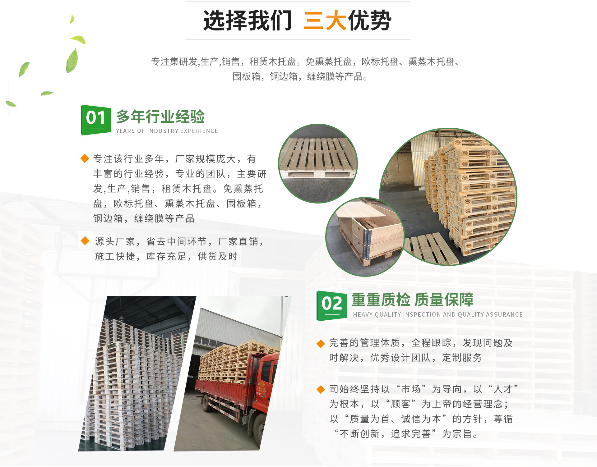 蕪湖奔騰包裝股份有限公司坐落于滬渝高速灣沚出口處3公里,距離灣沚高鐵站6公里,蕪宣客運機場5公里,交通十分便利。我公司是專注集木托盤研發(fā),生產(chǎn),銷售,租賃的綜合服務商。本公司生產(chǎn)的免熏蒸托盤,歐標托盤、熏蒸木托盤、圍板箱,鋼邊箱等產(chǎn)品遠銷海內(nèi)外。公司本著“以質(zhì)量求生存,以信譽謀發(fā)展,以服務拓出路”的服務經(jīng)營理念;重視產(chǎn)品質(zhì)量和服務,為用戶著想。根據(jù)客戶需求,及時送貨。公司始終堅持以“市場”為導向,以“人才”為根本,以“顧客”為上帝的經(jīng)營理念;以“質(zhì)量為首、誠信為本”的方針,尊循“不斷創(chuàng)新,追求完善”為宗旨。本著生產(chǎn)廠家,減少中間流通環(huán)節(jié)的原則,讓利于每位客戶朋友。我們的產(chǎn)品價格合理,質(zhì)量過硬,真誠歡迎各方客商前來業(yè)務洽談與合作。
